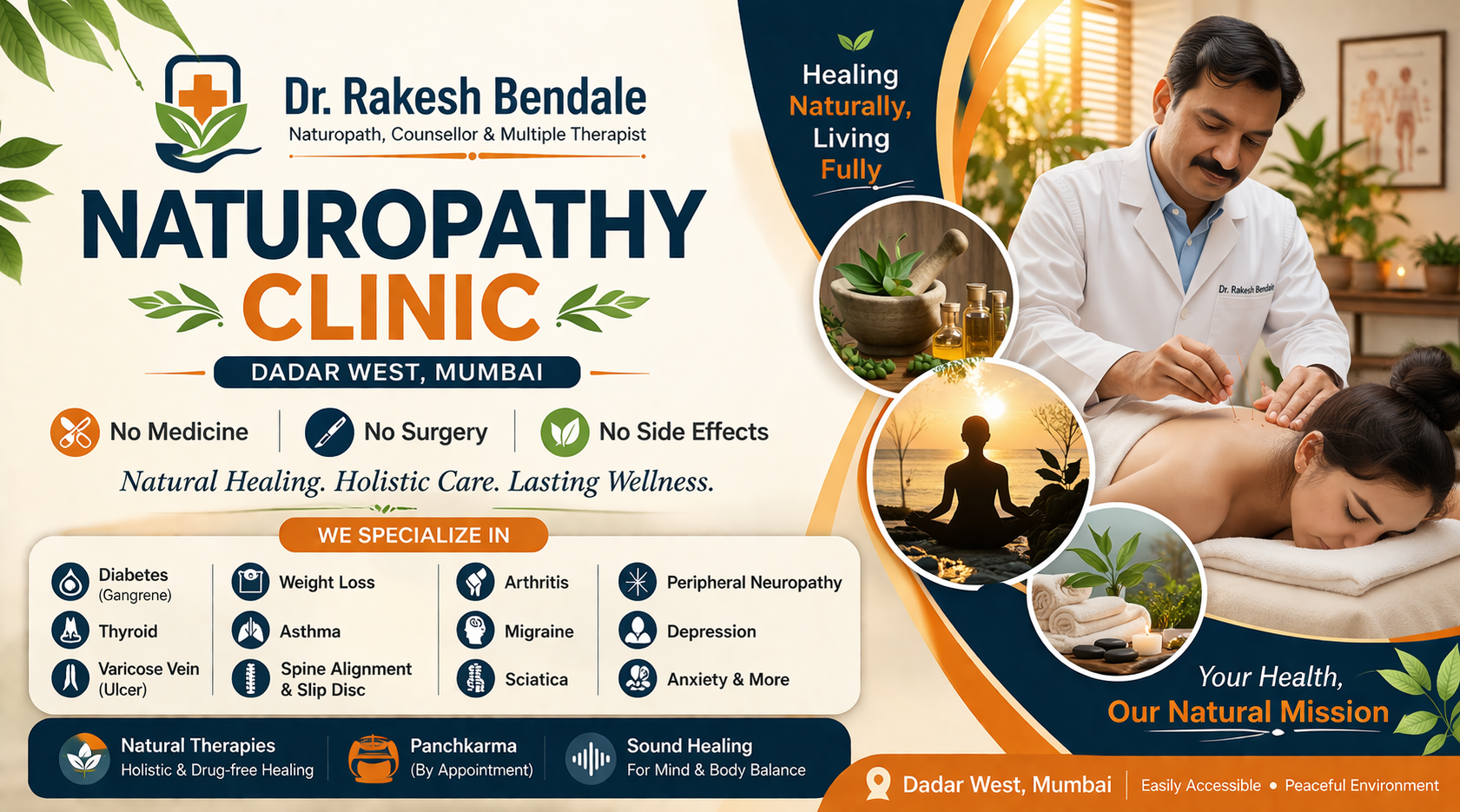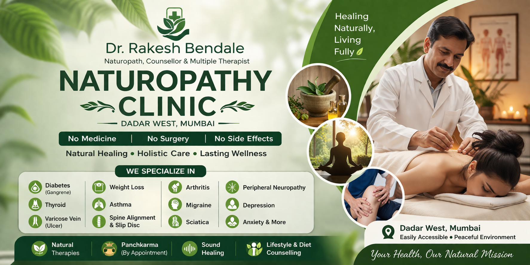 Located in the heart of Dadar West, Mumbai, this Naturopathy Clinic led by Dr. Rakesh Bendale offers a holistic, drug-free approach to healing. The clinic focuses on treating the root cause of diseases using natural therapies, lifestyle correction, and non-invasive treatment methods.